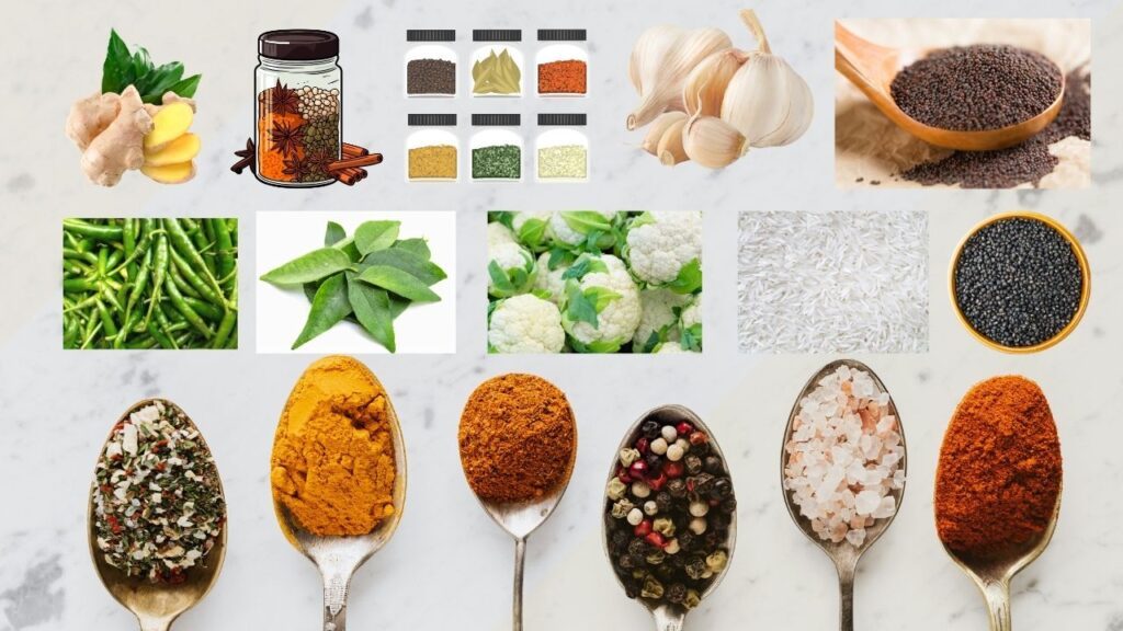 • Spices: Turmeric, cumin, coriander, garam masala, mustard seeds